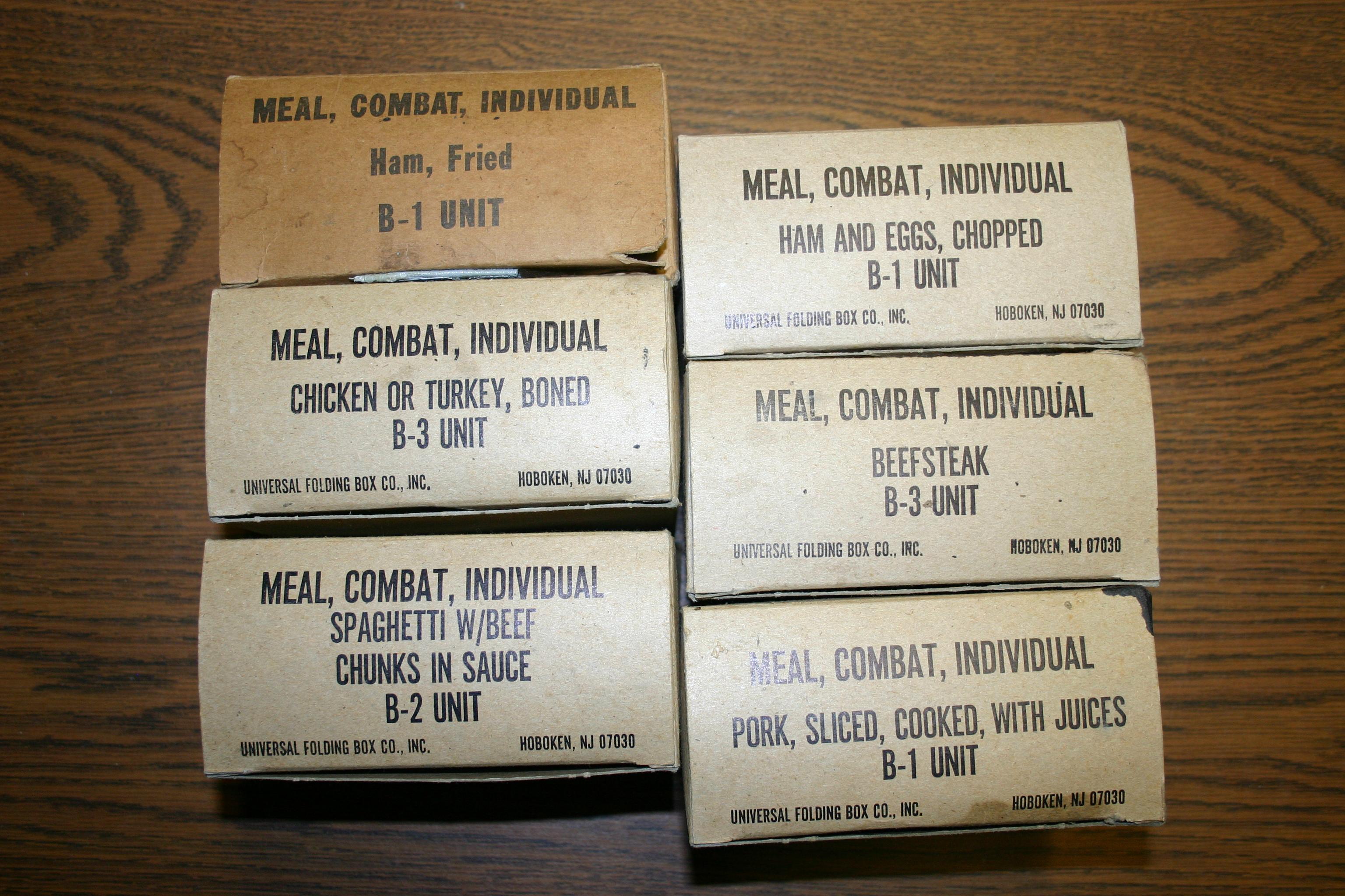 B Ration boxes: Fried Ham; Boned Chicken or Turkey; Spaghettie with Beef Chunks in Sauce; Ham and Eggs, Chopped Ham and Eggs; Beefsteak; Sliced and Cooked Pork with Juices