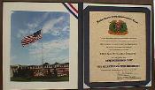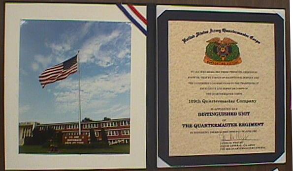 Phot of US Army Quartermaster Center & School and certificate identifying 109th Quartermaster Company as a Distinguished Unit of the Quartermaster Regiment