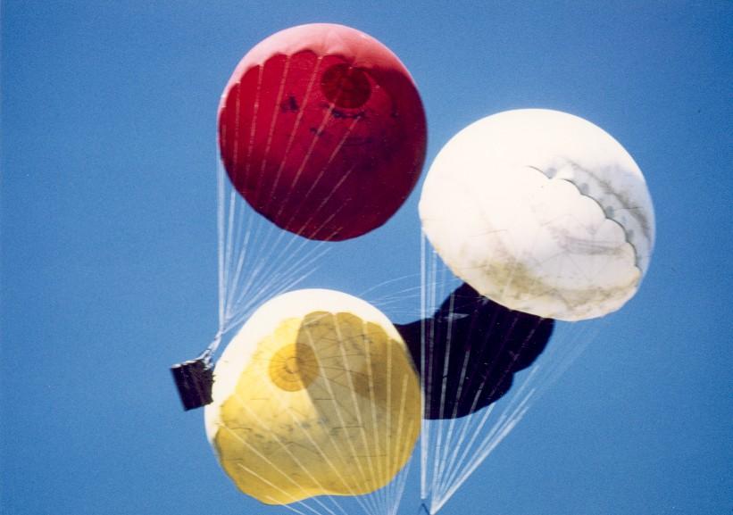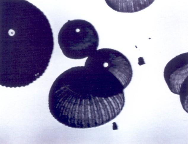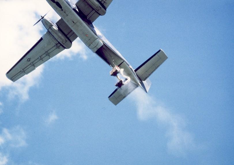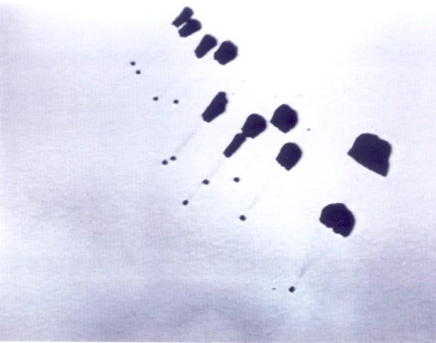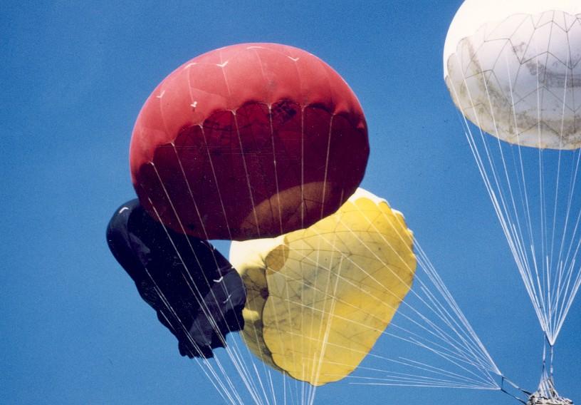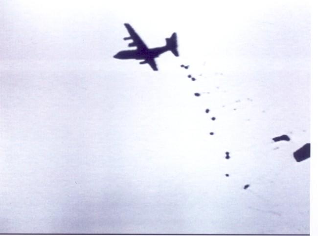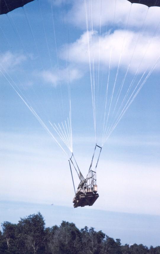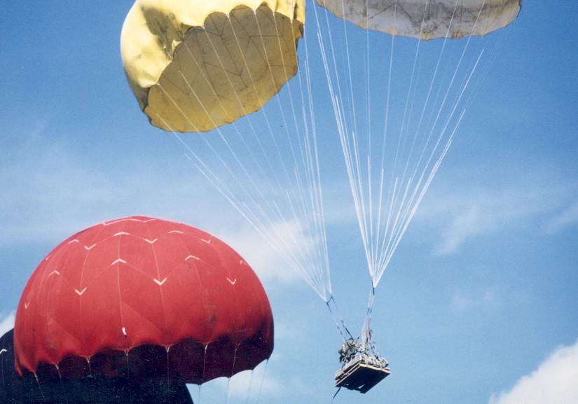 Parachutes are trailing behind pallets as they open in slipstream. Note the arrow in relation to parachutes. The loads have just come out of the airplane and haven't turn down yet.