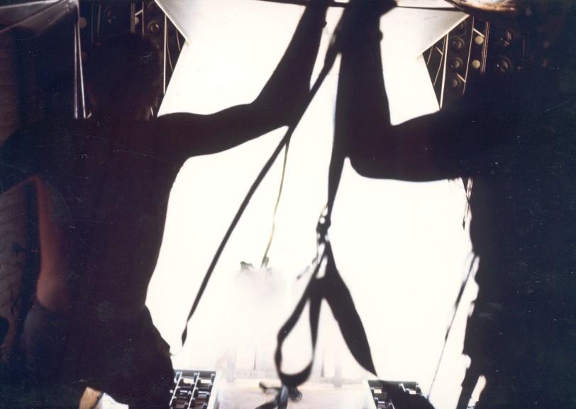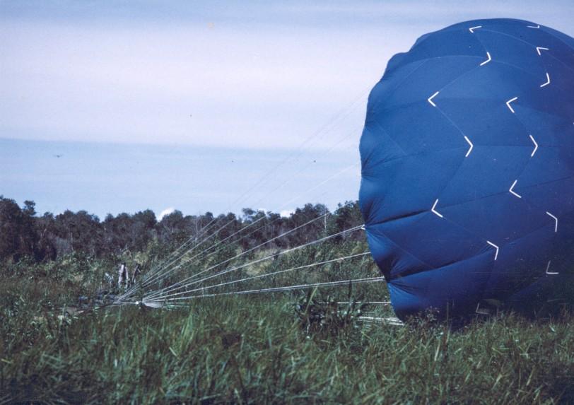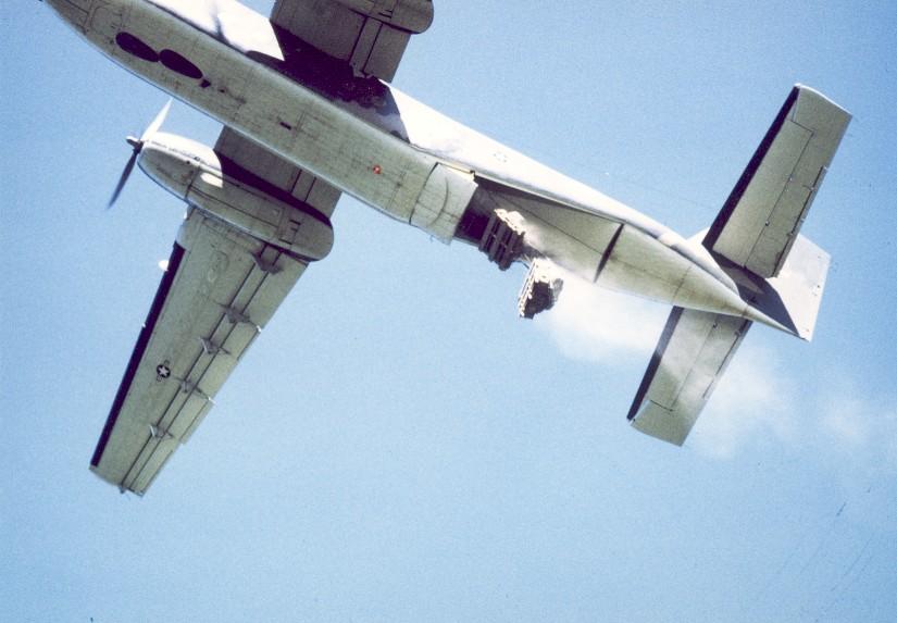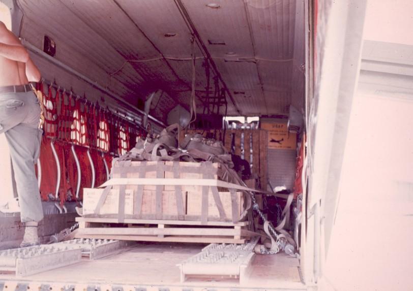 Small arms ammo rigged with A-22's Korean War cotton parachutes inside C7A aircraft.