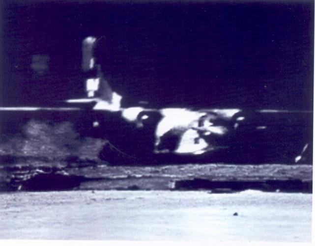 Inside of cockpit of C-130 after landing with blown tires. Fire damage.