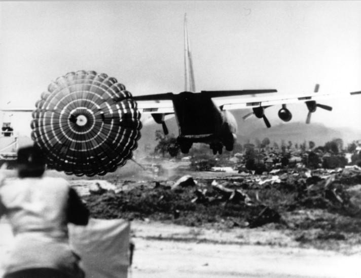 Low Altitude Delivery - A US Air Force C-130 Hercules crew drops a bundle of supplies to the US Army 1st Cavalry Division (Airmobile) at An Khe in South Vietnam. On the paradrop, a 315th Air Division Hercules crew delivered more than two tons of supplies using the Low Altitude Parachute Extraction System (LAPES) and Parachute Low Altitude Delivery System (PLADS) developed by the Air Force's Tactical Air Command. Official US Air Force Photo released by the Department of Defense Washington, DC June 28th, 1966