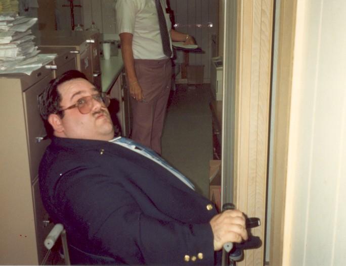 September 18, 1989 Time 10:30 A.M. C.S.T. Picture of Mr. Barry A. Krupkin, in his wheelchair, caught stuck in the hallway of the Monroe County Resource center building unable to fit into bathroom; a clear violation.
