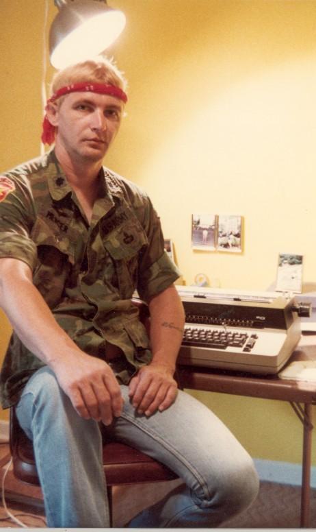 'Mercer' Wearing my old ranger jungle jacket from 'Nam. Photos on wall in this photo is of a Filipino team member 'Kigie' in Baguio City ('83) Taken in Philippines by Mai-bing