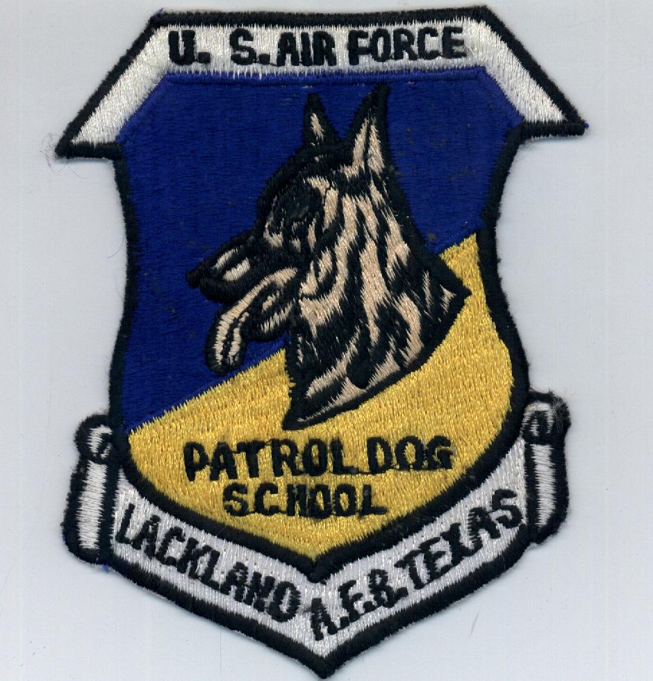 USAF Patrol Dog School Instructors Large Version Pocket Patch Lackland AFB, San Antonio, Texas from 1967 on. The Patrol Dog Program was initiated at the USAF K-9 Training facility at Lackland AFB to train the new standard Military Working Dog. The program produced dogs that could be worked in a crowded public place and would attack only on command of handler.