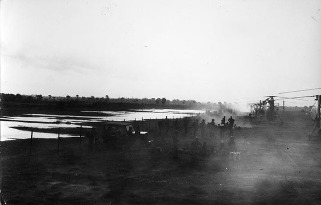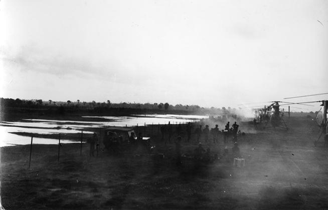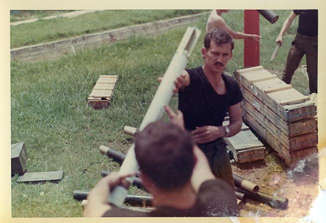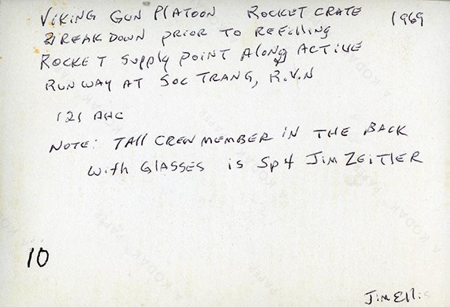 Viking Gun Platoon rocket crate breakdown prior to refilling rocket supply point along active runway at Soc Trang, R.V.N