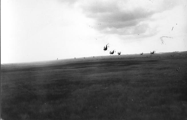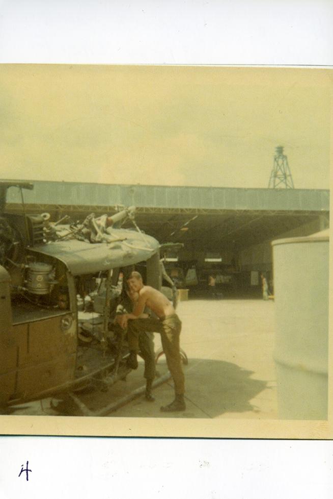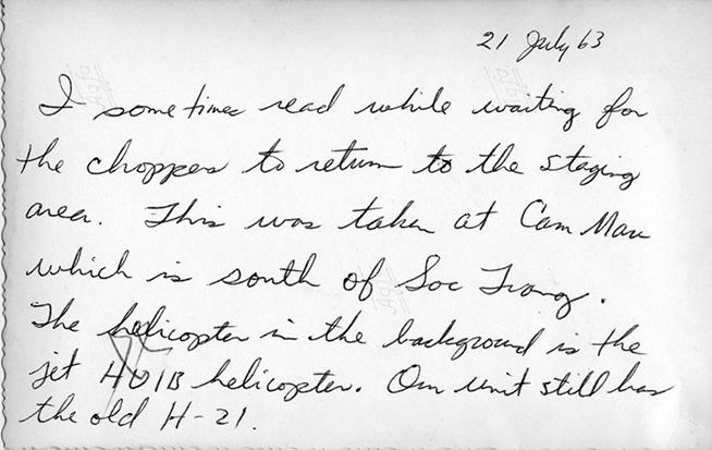 I sometimes read while waiting for the chopper to return to the staging area. This was taken at Cam Mau which is south of Soc Trang. The helicopter in the background is the jet HO1B helicopter. Om unit still has the old H-21.