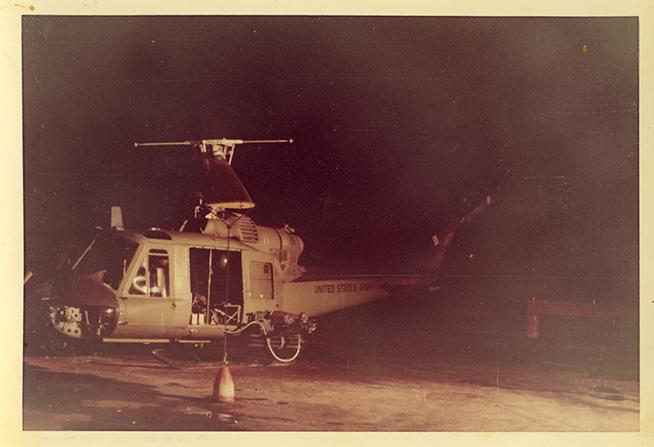 Night time - tied down UH-1B gunship in revetment along the runway at Soc Trang air field