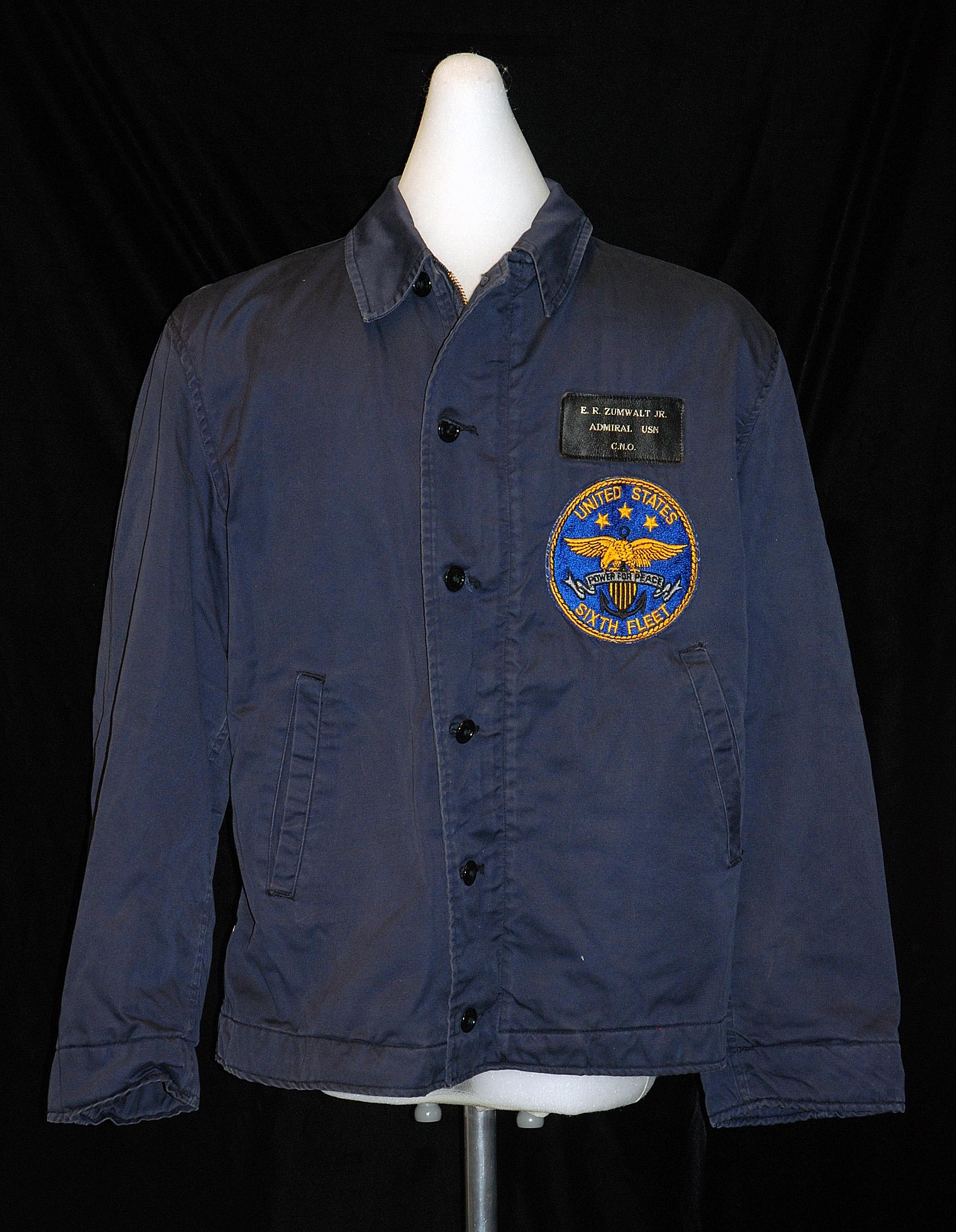 Navy blue cloth jacket worn by Admiral Zumwalt. The jacket has a United States Sixth fleet patch and a name plate with E. R. Zumwalt Jr. Admiral USN, C. N. O. sewn to the proper left front Panel of the jacket.