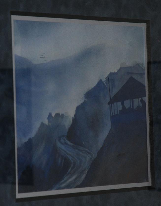This trail and village depiction is from a photo sent to the donor by Jim Michener, who had been a U.S. Army UH-1 pilot in Vietnam and lived in Laos for more than thirty years. The village is actually along the road between Vientiane and Luang Prabang, but in the painting it is meant to be a village in Khammouane Province. There is a guard post at the right-hand side and in the horizon a flight of fighters with a KC-135 tanker. The latter would have been along the border of Laos and Thailand, as all the main refueling orbits were within Thailand (never in Laos).
