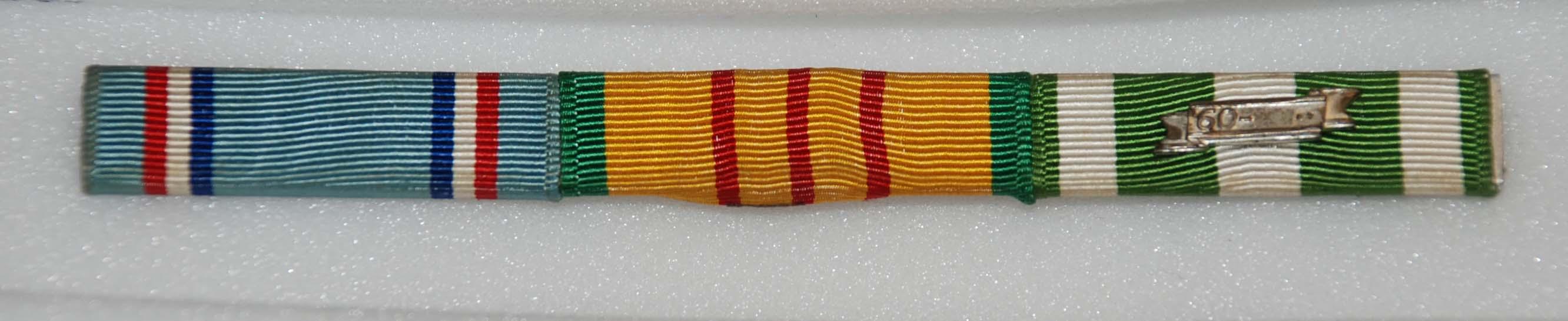 Ribbon bar holder with Air Force Good Conduct Ribbon, Republic of Vietnam Service Medal Ribbon, and Republic of Vietnam Campaign Ribbon with 1960 Device displayed on it.