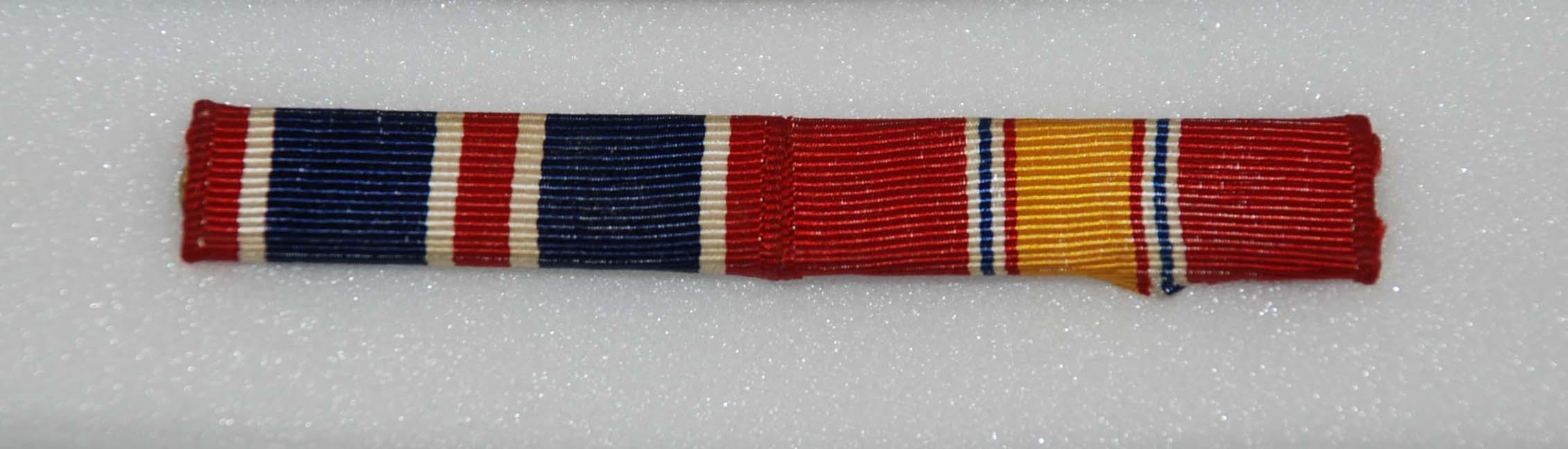 Ribbon bar holder with Air Force Outstanding Unit Award Ribbon and National Defense Medal Ribbon displayed on it.