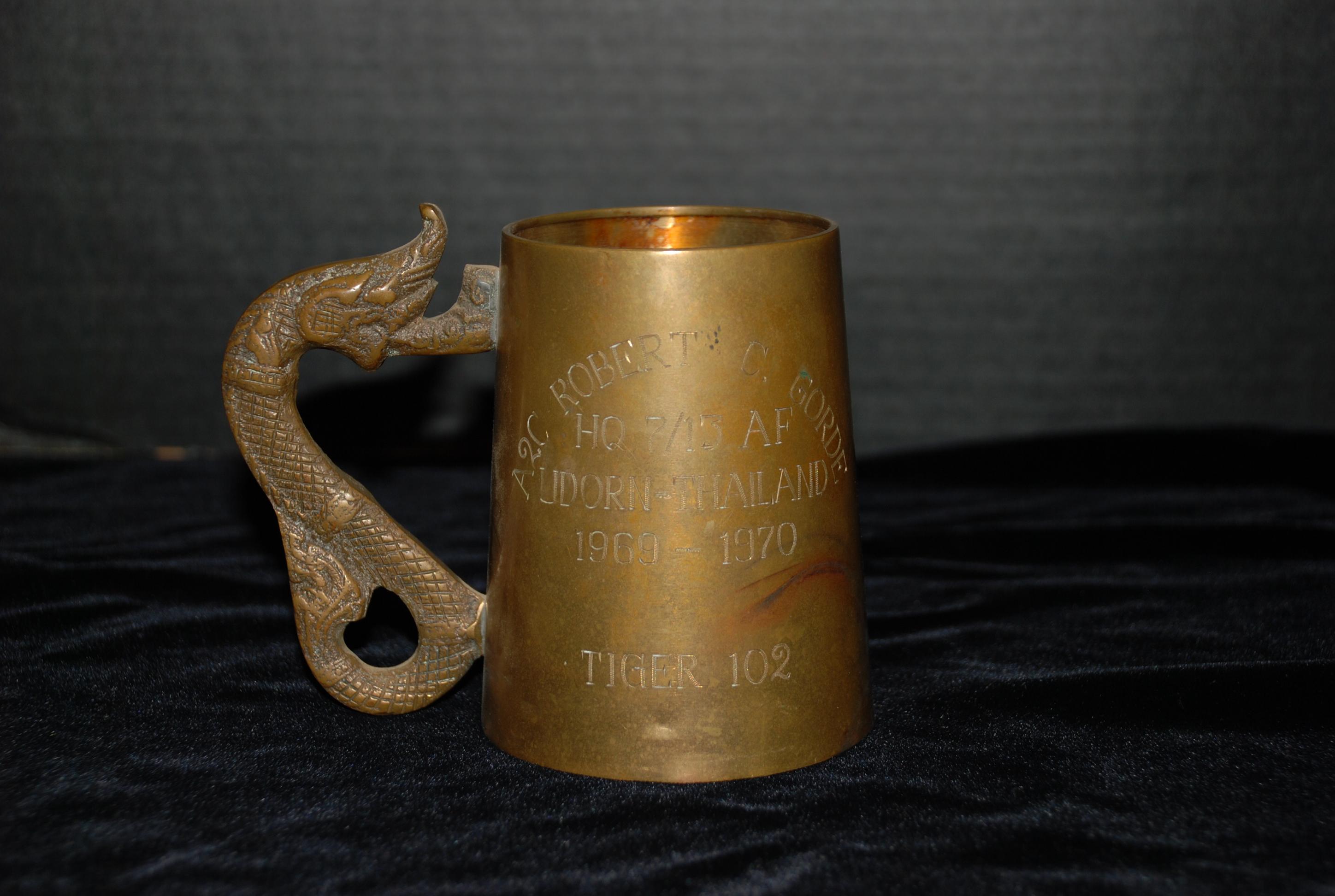 Brass beer stein with engraving: A2C Robert C. Gorde - HQ 7/13 AF - Udorn-Thailand - 1969-1970 - Tiger 102