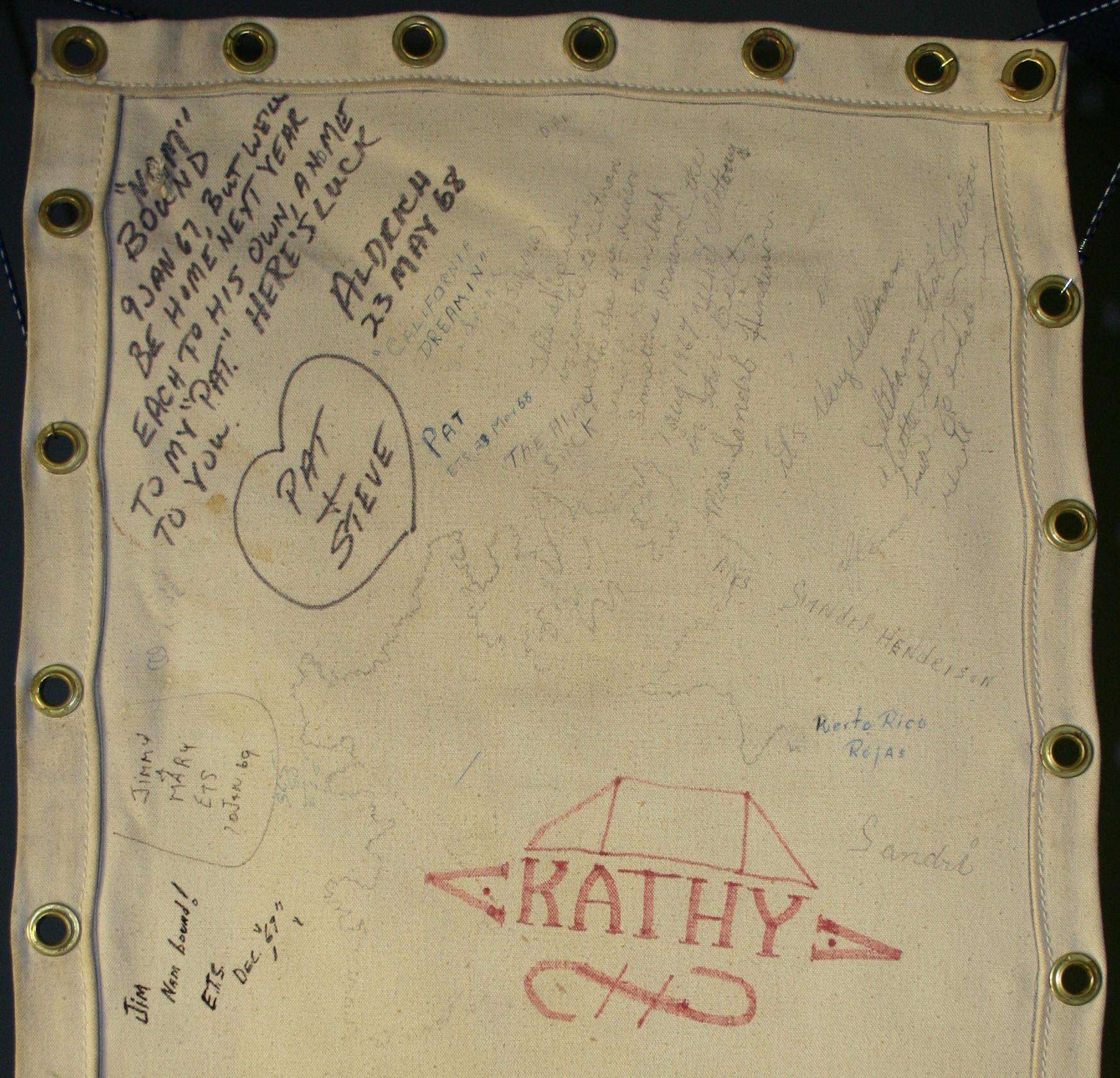 Nam bound 9 Jan 67, but we'll be home next year. Each to his own, and me to my Pat. Here's luck to you. Aldrich 23 May 68
