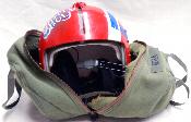 Flight helmet decorated with 'Cherry Boy' in carrying bag