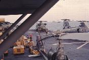 - 5 helos on deck CH-53s left, UH-1E, USN 46