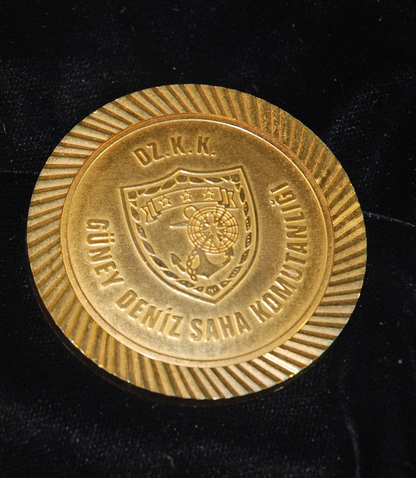 Admiral Elmo R. Zumwalt's DZ. K. K. Guney Deniz Saha Komutanligi, the back of the coin reads: To Admiral E.R. Zu8mwalt Jr. (U.S. Navy), From Vice Admiral Cemal Suer (Tur. Navy), 16 July 1979 Izmir-Turkey