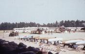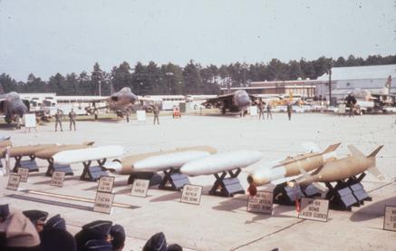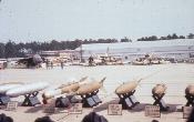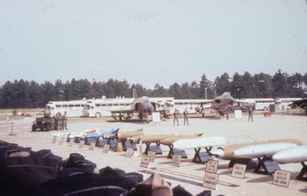 Armed F-4 and F-105 on tarmac with various weapons displayed in front (BLU-27, BLU-23, SUU-23, SUU-7, CBU-24, etc)
