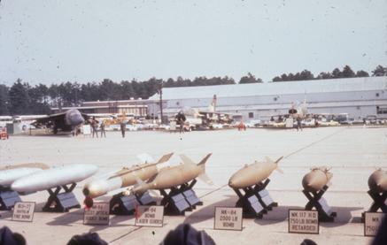 Armed F-4, F-105, F-111, and A-7 on tarmac with various weapons displayed in front (Mk-84, BLU-27, BLU-23, SUU-23, SUU-7, CBU-24, etc)