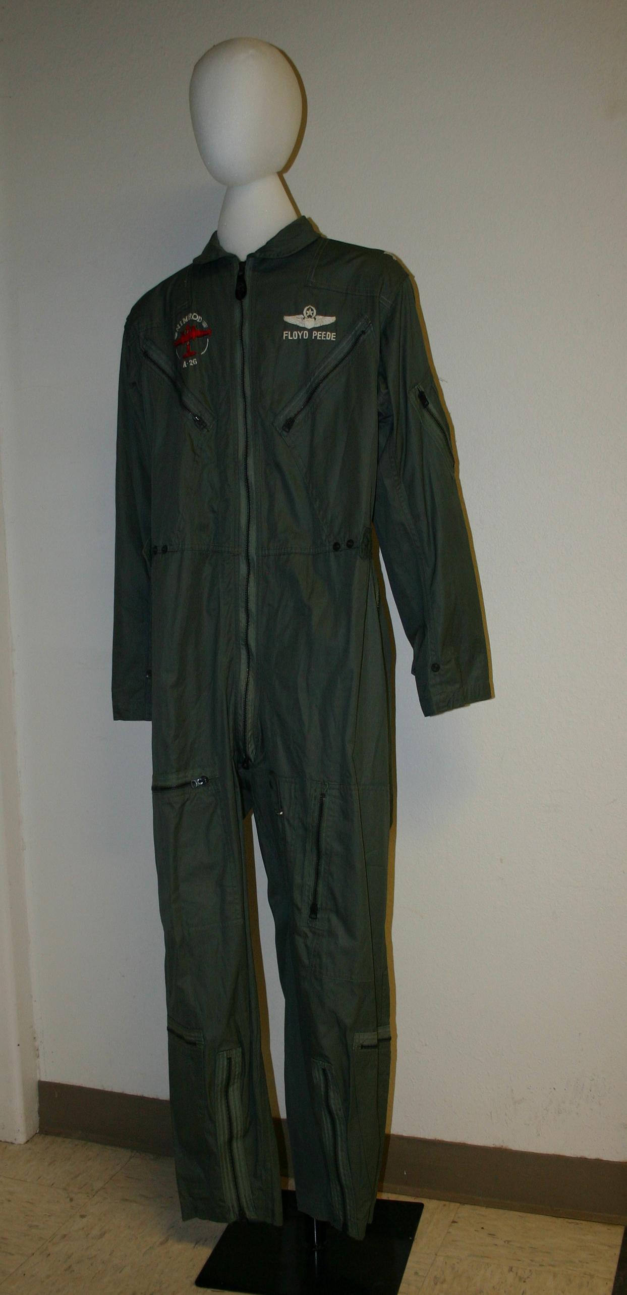 Flight suit originally owned by Colonel Floyd Peede. Colonel's insignia on soldiers, Nimrod A-26 with depiction right breast, and 'Floyd Peede' with command flight wings on left breast.